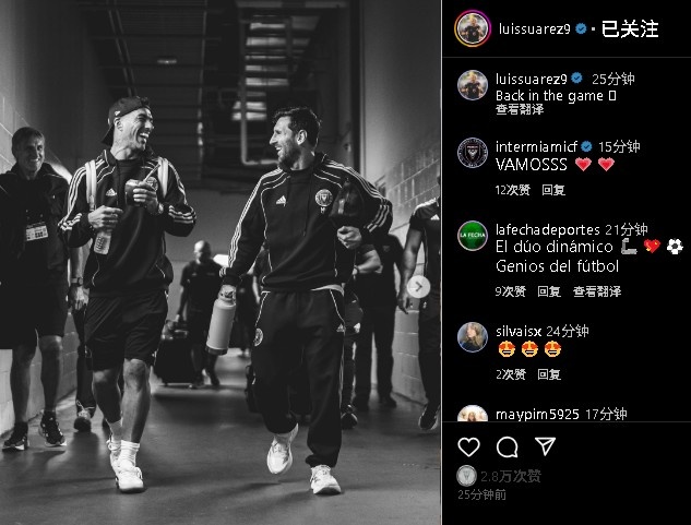 赛后,本场解禁复出的苏亚雷斯晒出自己和梅西的合照并配文:回归赛场。