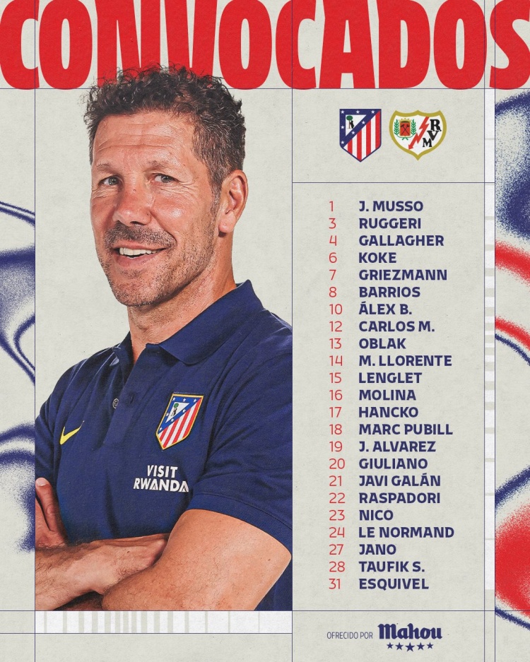 马竞对阵巴列卡诺大名单