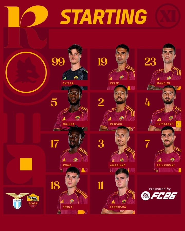 罗马杆位:99-斯维拉尔、19-切利克、23-曼奇尼、5-恩迪卡、2-伦施、3-安吉利诺、4-克里斯坦特、17-科内、7-佩莱格里尼、18-苏莱、11-埃文·弗格森